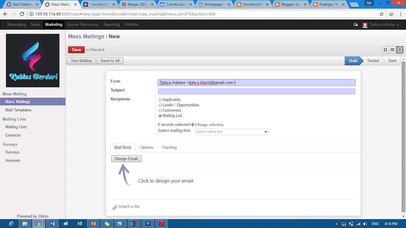- Create Mass Mailing. Tahapan ini yang harus diisi yaitu Subject, Recipients (Bisa memilih dengan mengklik button pada Recipients dalam menu tsb)