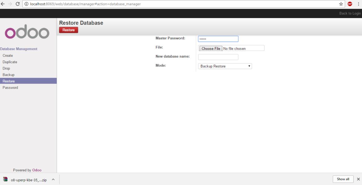 1.Masuk ke odoo melalui localhost:8069. Pilij/klik menu restore di bagian menu kiri.